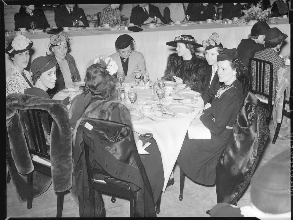 Nous voyons des femmes de la «Junior League» assises autour d'une table dans la salle à manger de l'hôtel Ritz-Carlton situé au 1228, rue Sherbrooke Ouest à Montréal