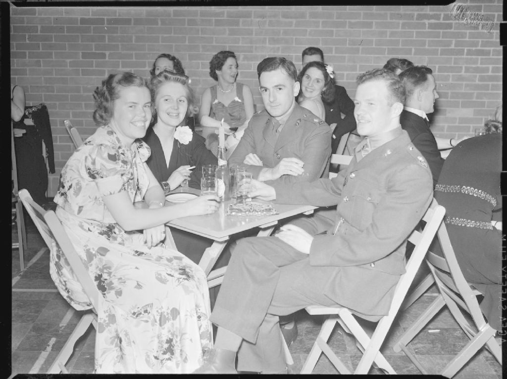Jean Lynca, Joy Tonstad, Ew. Johnson et Cd. Munro de la «Royal Canadian Army», sont assis autour d'une table au bal du régiment des «17th Duke of York's Royal Canadian Hussars»