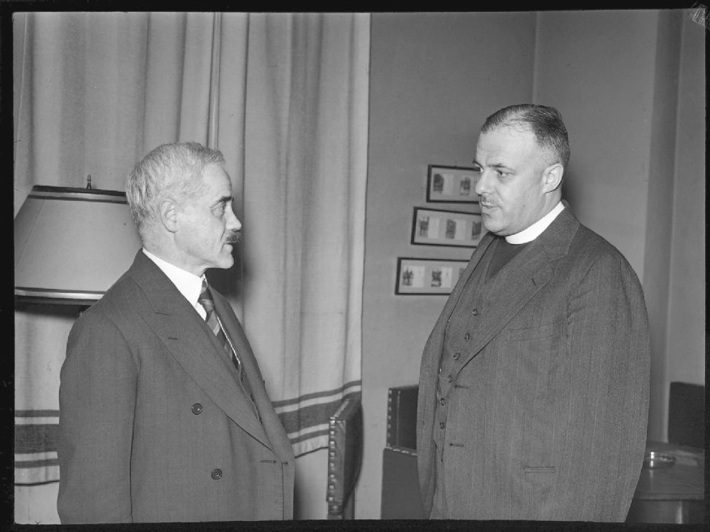 Nous voyons le révérend F.H. Wilkinson, aumônier du régiment des «17th Duke of York's Royal Canadian Hussars» et J. Edouard Labelle, président de la «Canadian Vickers»