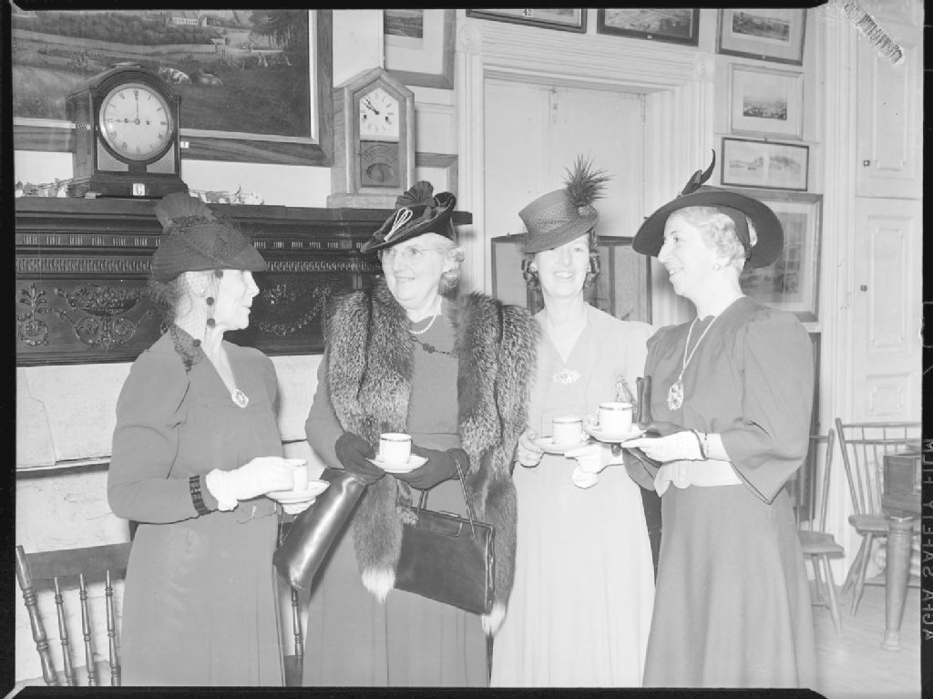 Des femmes du «Catholic Women's Club» prennent le thé. À l'arrière-plan nous voyons des tableaux au mur et deux horloges antiques sur la tablette de la cheminée du foyer