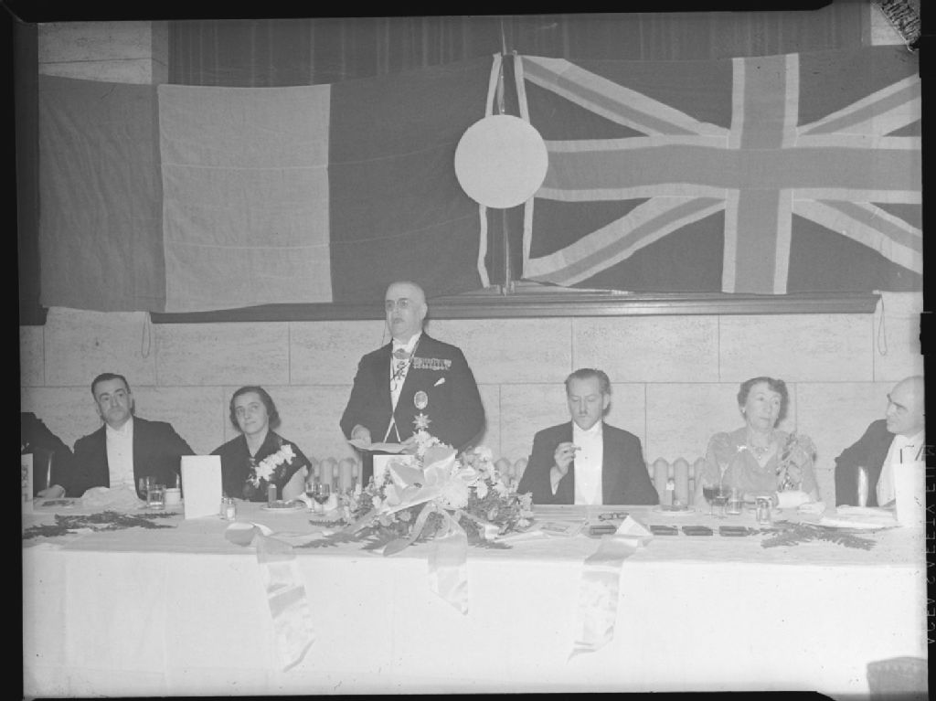 Nous voyons les invités de la table d'honneur du banquet d'un congrès d'architectes. Sir Eugène Fiset, dix-neuvième lieutenant-gouverneur du Québec prononce une allocution devant un mur décoré du drapeau «Union Jack»