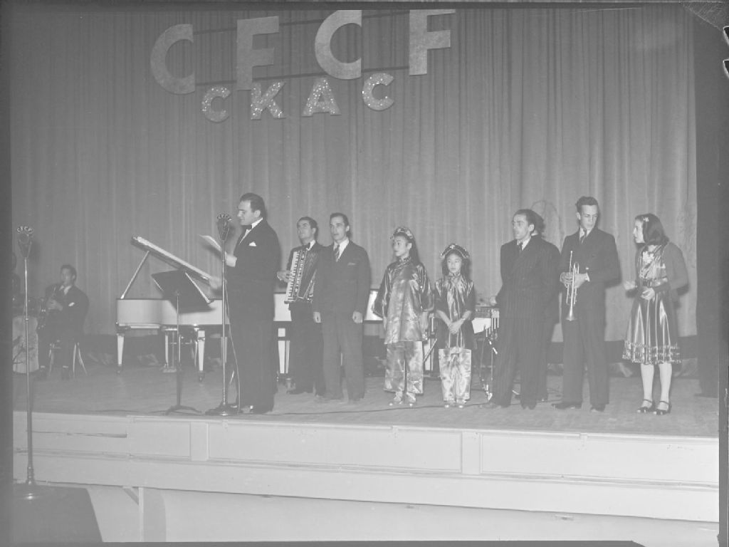 Les «Ken Soble's Amateurs» présentent un spectacle diffusé par CFCF et CKAC. Sur la scène, nous voyons un accordéoniste, un trompettiste, un saxophoniste, deux petites chanteuses et d'autres personnes près d'un piano à queue