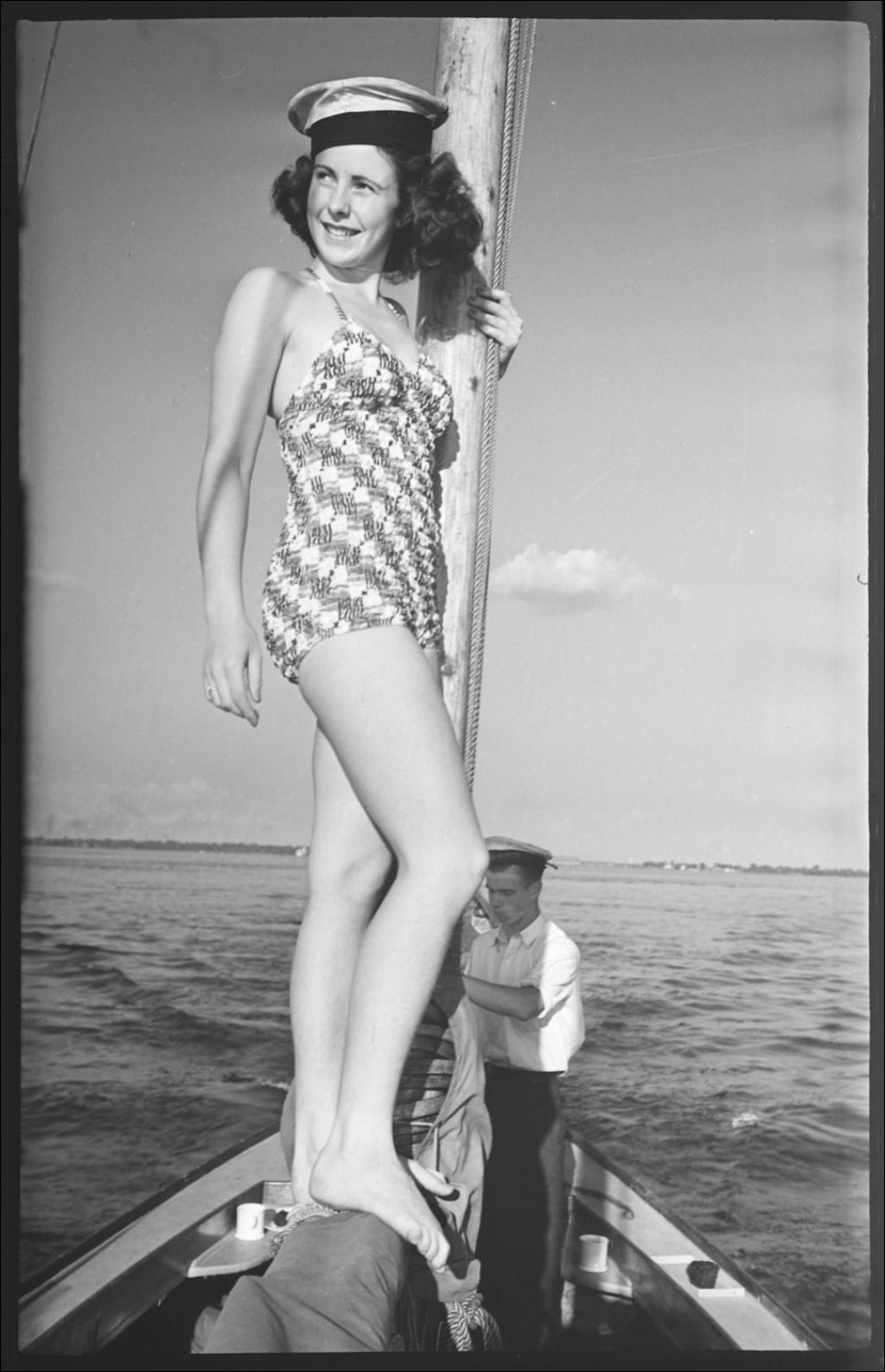 Eileen Greenwood, vêtue d'un maillot de bain et coiffée d'un béret, se tient au mât d'un voilier. Un cadet de la marine, un «Sea Scout», est à la proue