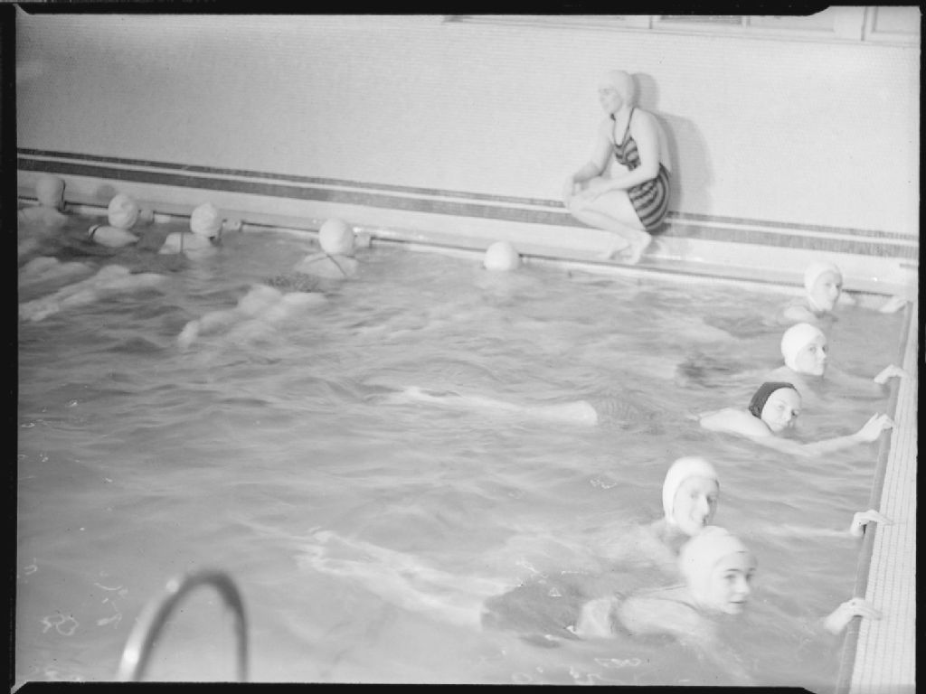 Des jeunes filles, sous la supervision d'une monitrice de natation, nagent dans la piscine de la Young Women's Christian Association (Y.W.C.A.) de Westmount