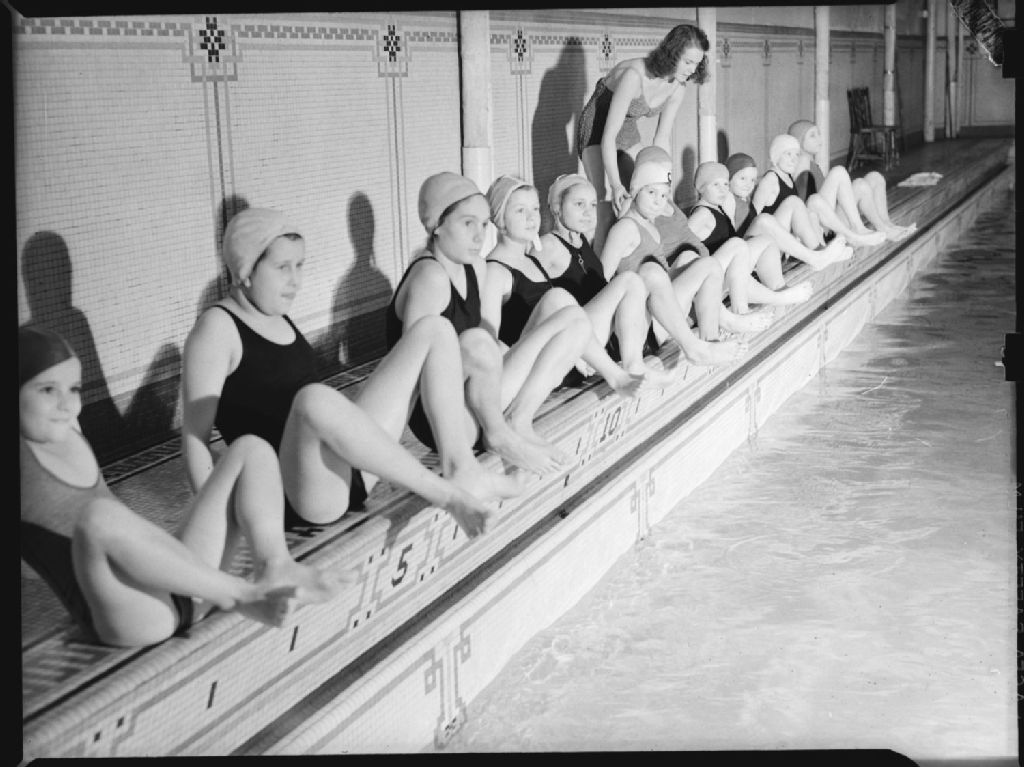 Des fillettes, sous la supervision d'une monitrice de natation, pratiquent le coup de pied de brasse assises sur le bord de la piscine de la Young Women's Christian Association (Y.W.C.A.) de Westmount