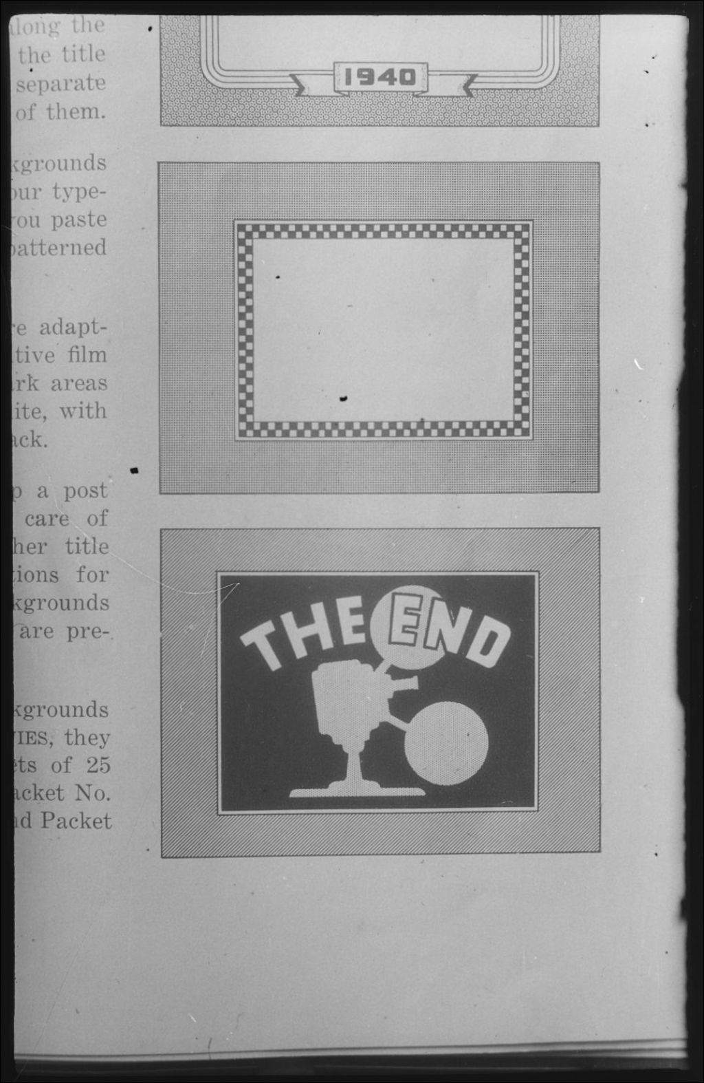Nous voyons deux arrière-plans de titres de générique de films d'amateur. L'un représente un encadré avec motifs à carreaux, l'autre une caméra et les mots «The End»
