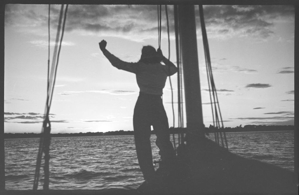 Jackie Bennnett est debout à la proue d'un voilier naviguant sur le lac Saint-Louis