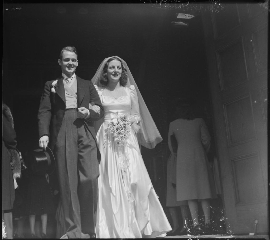 Nous voyons le couple de nouveaux mariés, les Rinfret-Jobin, sortant de l'église Saint-Léon de Westmount située au 4311, avenue Western (devenue boulevard de Maisonneuve Ouest) à Westmount