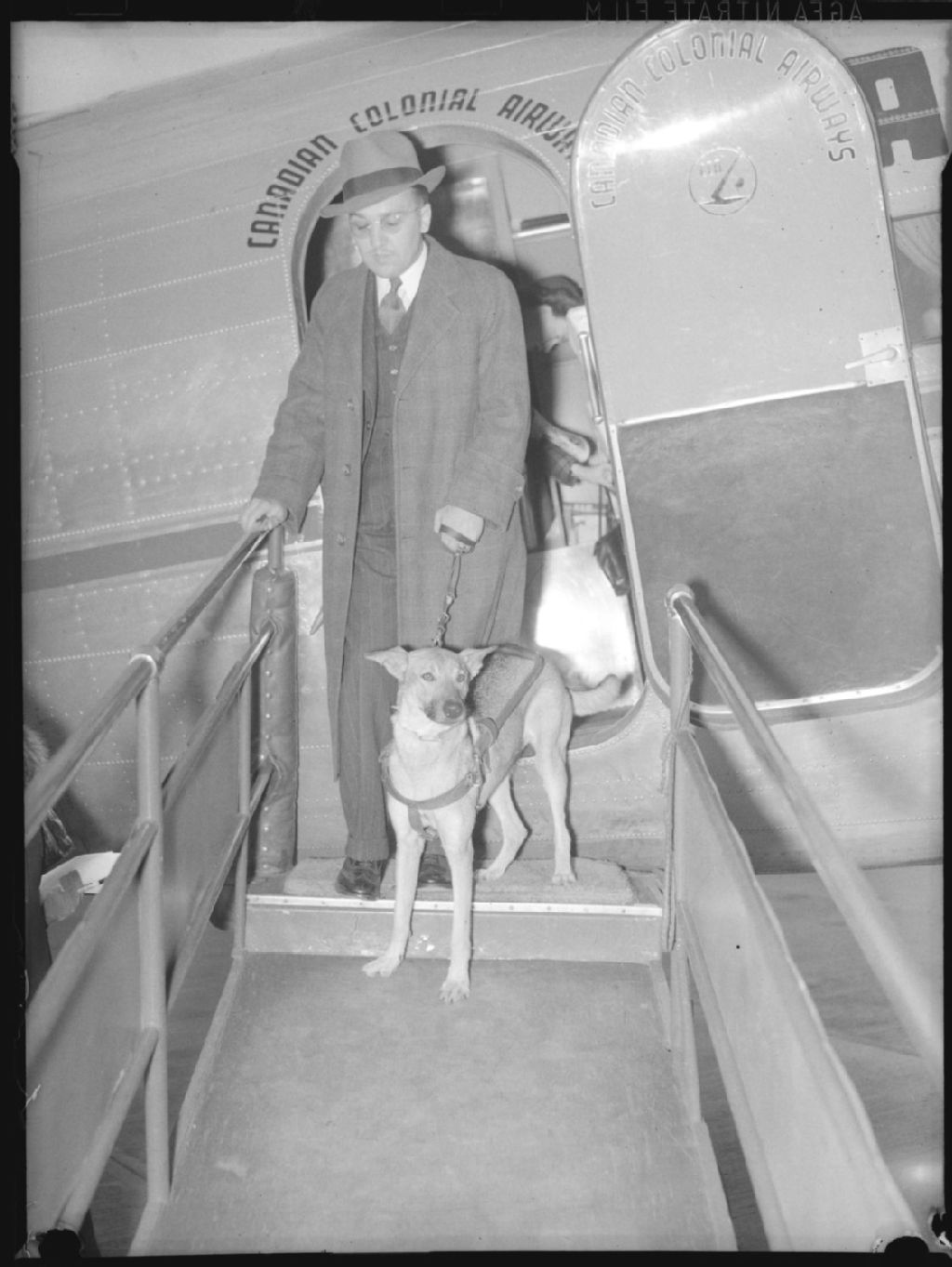 Nous voyons Monsieur Thomas à sa descente d'un avion de la «Canadian Colonial Airways» guidé par son chien d'aveugle