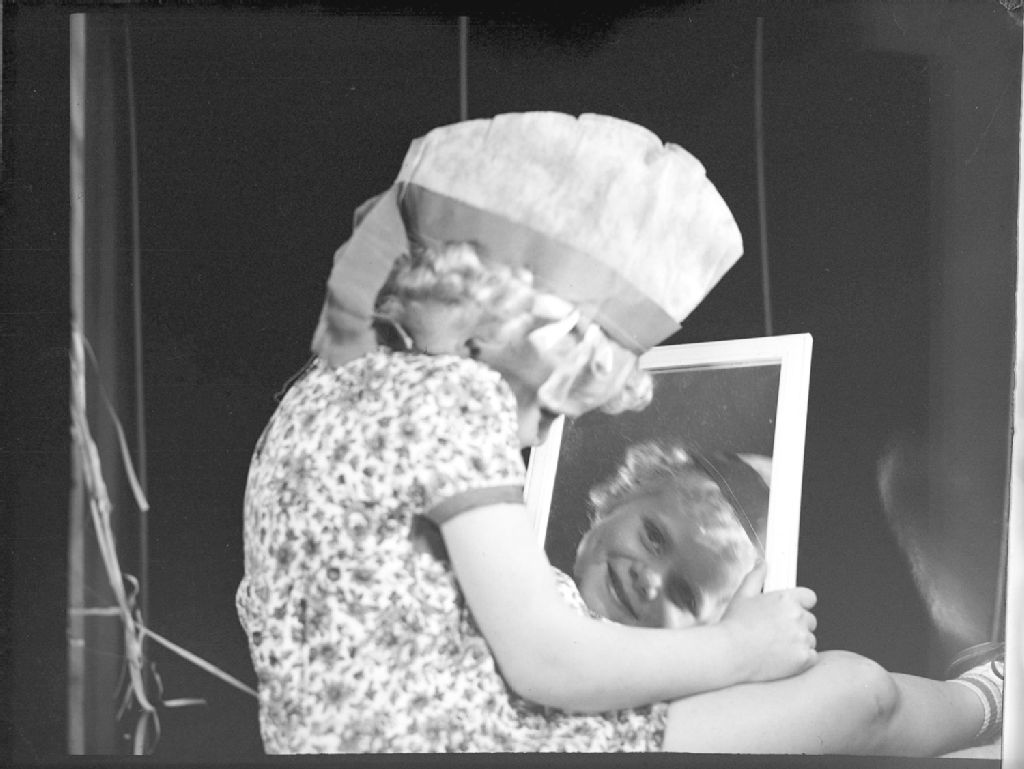 La petite Audrey Walker, coiffée d'un chapeau de papier, se regarde dans le miroir