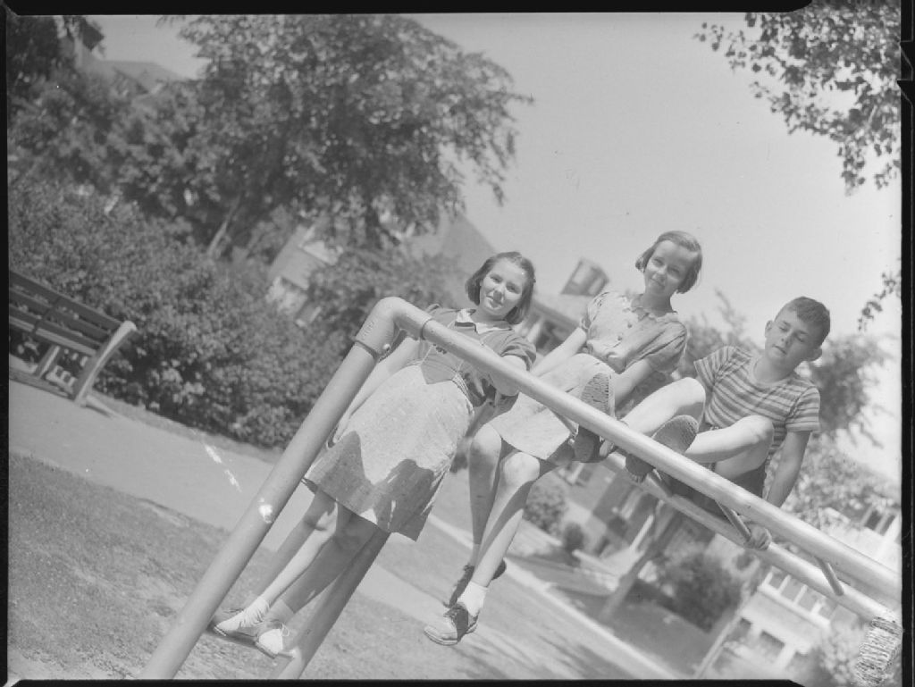Children. In Murray Park. Monique Durand, Xavière Lefebvre, Pierre Durand, 21 juin 1941, Archives nationales à Montréal, Fonds Conrad Poirier, (06M,P48,S1,P6383), Poirier, Conrad.