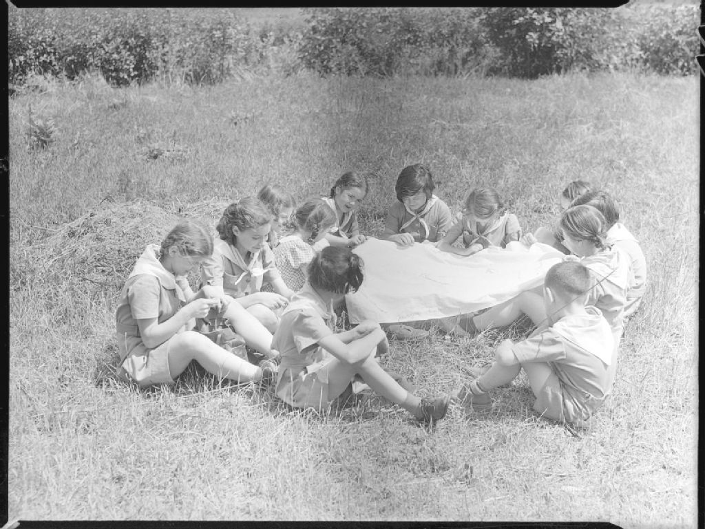 Des fillettes brodent leurs nom et prénom sur une grande toile. Elles sont assises dans l'herbe à la colonie de vacances de La Familiale située au 8818, rue Notre-Dame Est à Montréal