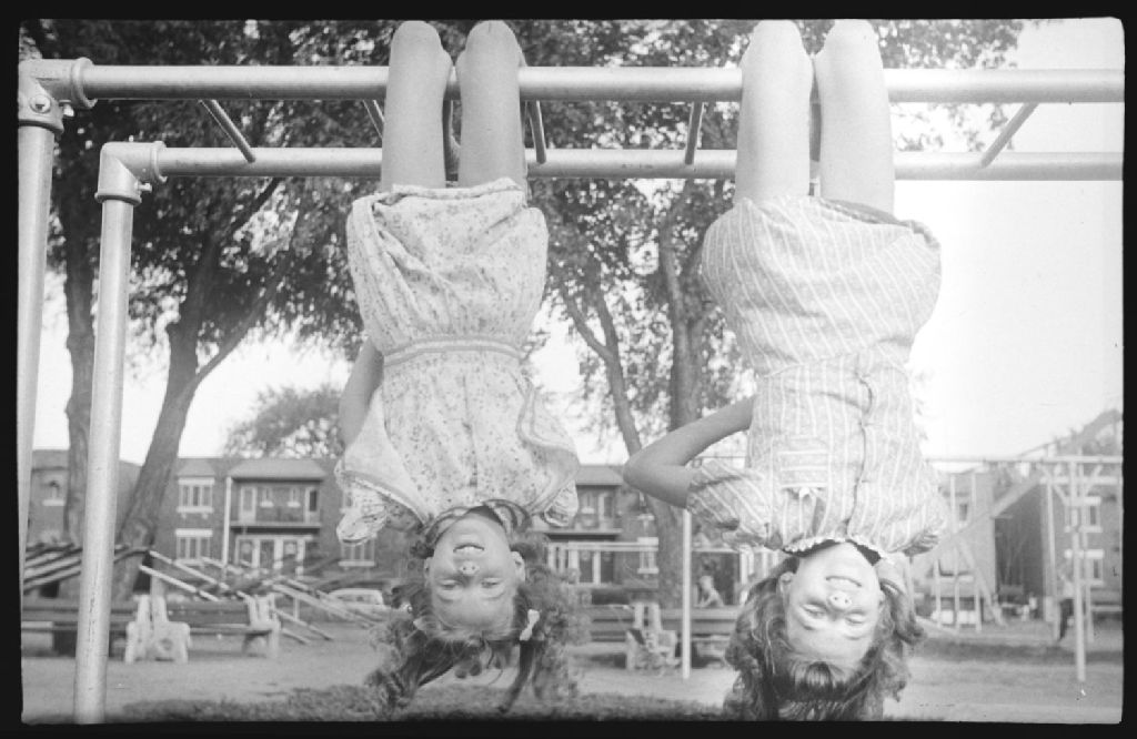 Pauline et Dorothy Luck sont suspendues la tête en bas, les pieds insérés dans les barres d'un portique de terrain de jeux
