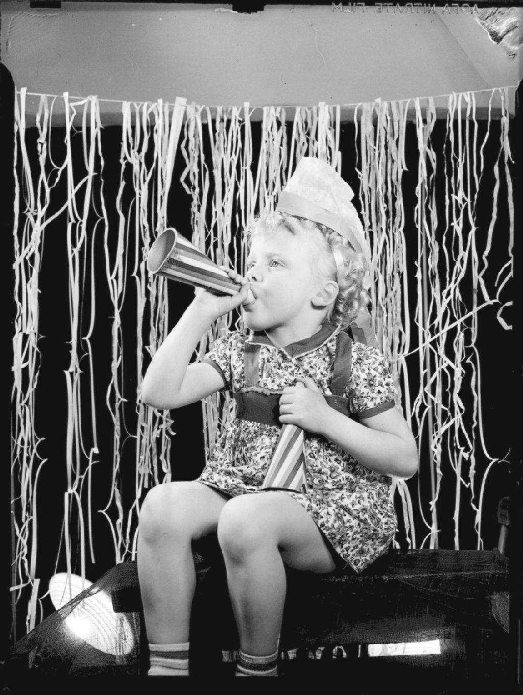 La petite Audrey Walker, coiffée d'un chapeau de papier, souffle dans un cornet de carton à une partie de Noël