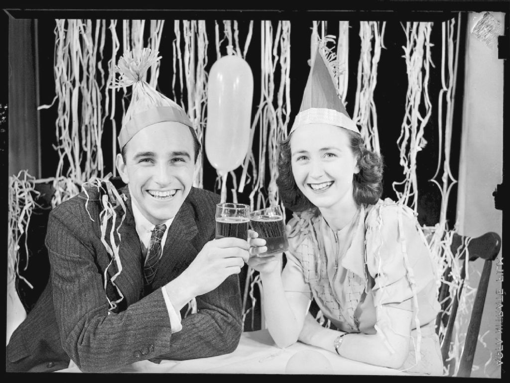 Josephine Kennedy et Harry Nice, coiffés de chapeaux de papier, trinquent à une partie de Noël