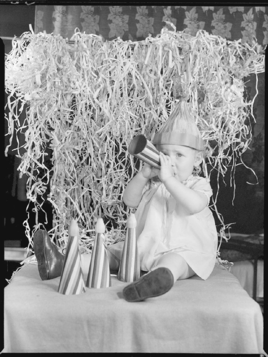 La petite Heather Geddie, coiffée d'un chapeau de papier, souffle dans un cornet de carton à une partie de Noël