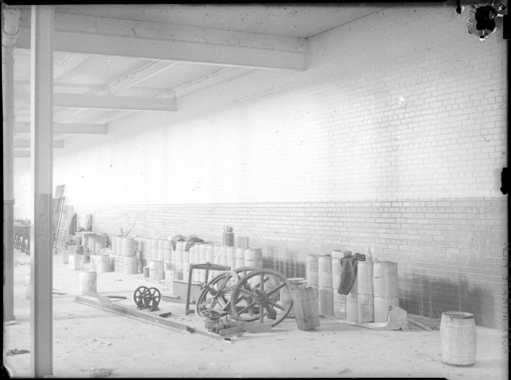 Nous voyons des bidons de peinture de «Brandram-Henderson Ltd», fabricants de peintures et de vernis, dans l'entrepôt de «Hollander A & Son Ltd», apprêteurs et teinturiers de fourrures