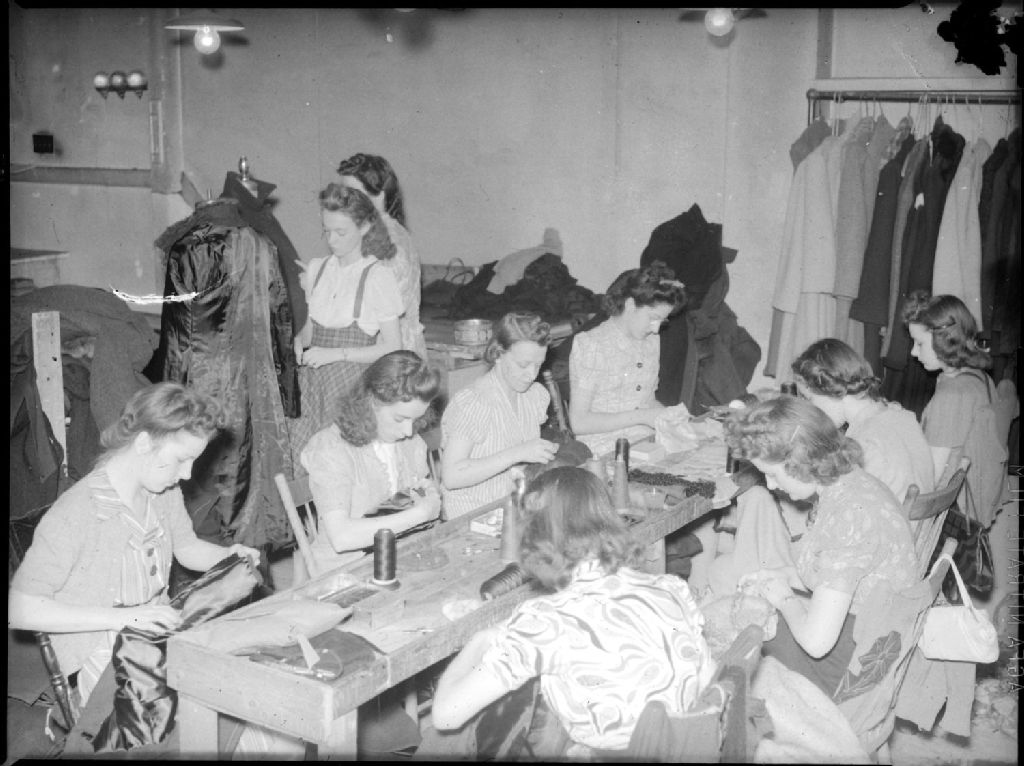 Des couturières cousent des manteaux à la manufacture de confection de vêtements pour femmes «Laniel Maurice Enrg» située au 7540-7542, rue Saint-Hubert à Montréal