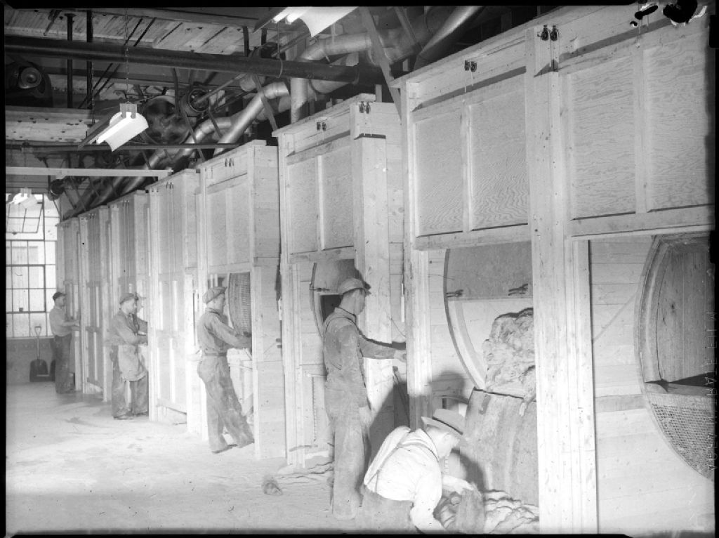 Nous voyons des ouvriers travaillant la fourrure chez «Hollander A & Son Ltd», apprêteurs et teinturiers de fourrures. L'immeuble où est établie cette compagnie est situé au 995, rue Smith à Montréal