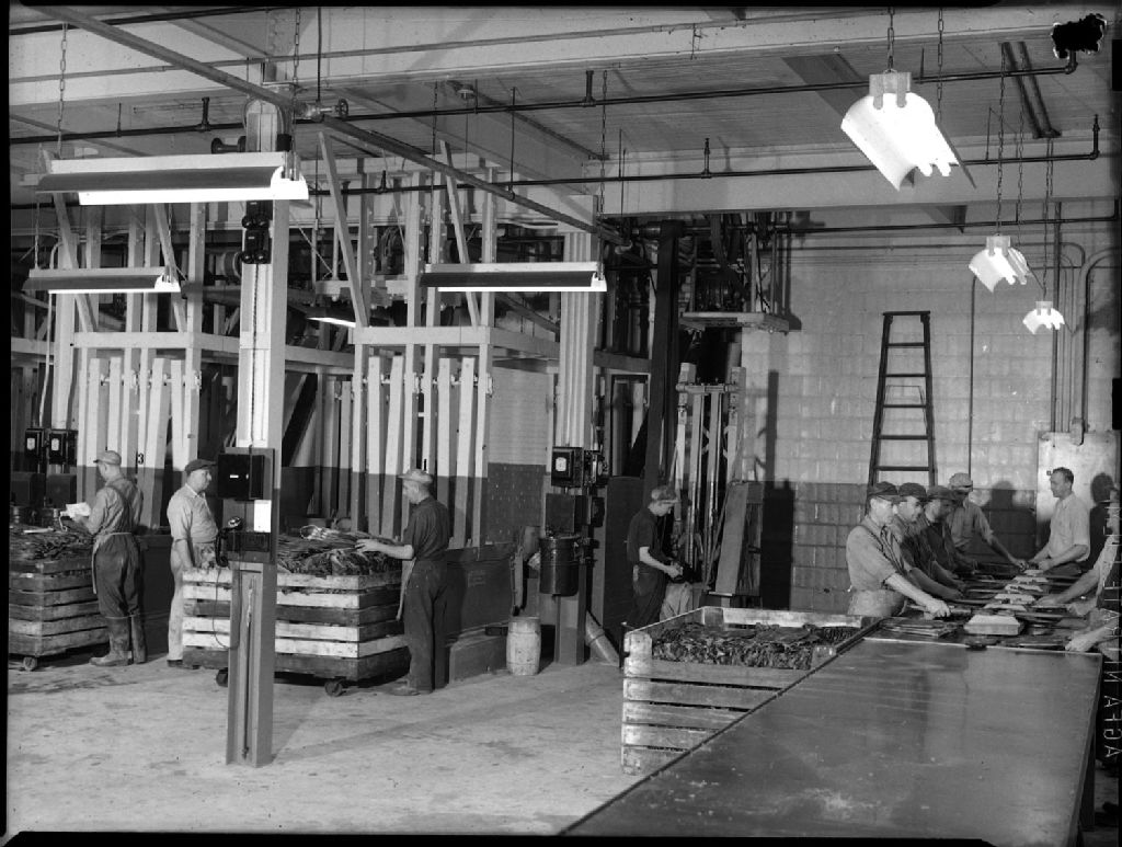 Des ouvriers de la compagnie «Hollander A & Son Ltd», apprêteurs et teinturiers de fourrures, font tourner les fourrures dans de gros cylindres métalliques. L'immeuble où est établie cette compagnie est situé au 995, rue Smith à Montréal