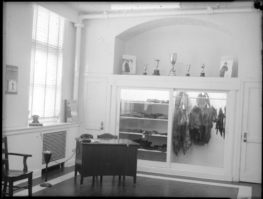 Nous voyons une salle d'exposition de trophées et d'échantillons de fourrures de «Hollander A & Son Ltd», apprêteurs et teinturiers de fourrures. L'immeuble où est établie cette compagnie est situé au 995, rue Smith à Montréal
