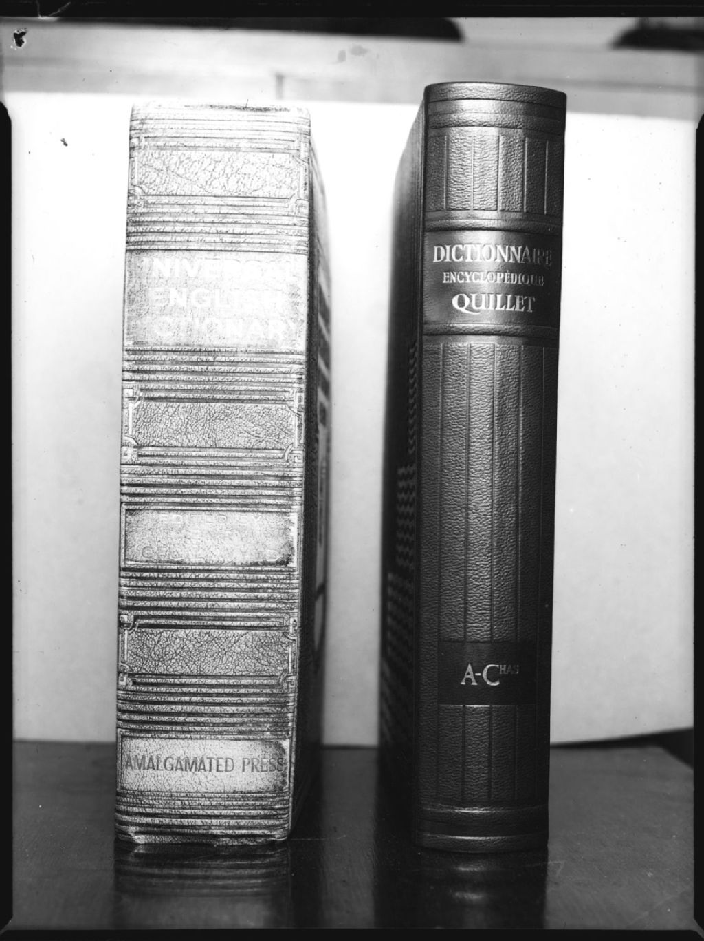 Nous voyons le dos des dictionnaires «Universal English Dictionary» et le «Dictionnaire encyclopédique Quillet»