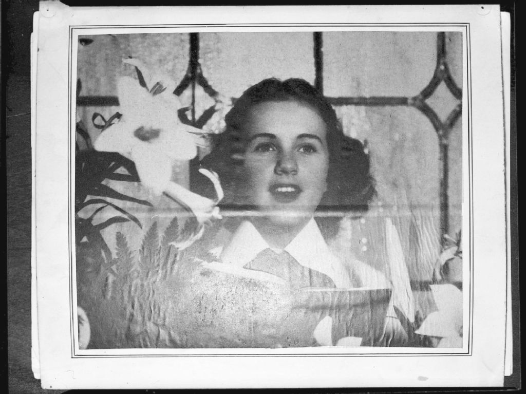 Nous voyons une photo de Deanna Durbin prise à travers une vitre