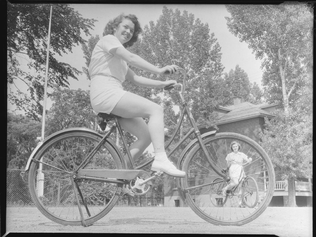 Lorraine Armour et Lumina Holmes sont sur leur vélo respectif. Nous voyons l'une d'elles à travers les rayons de roue du vélo de l'autre situé au premier plan