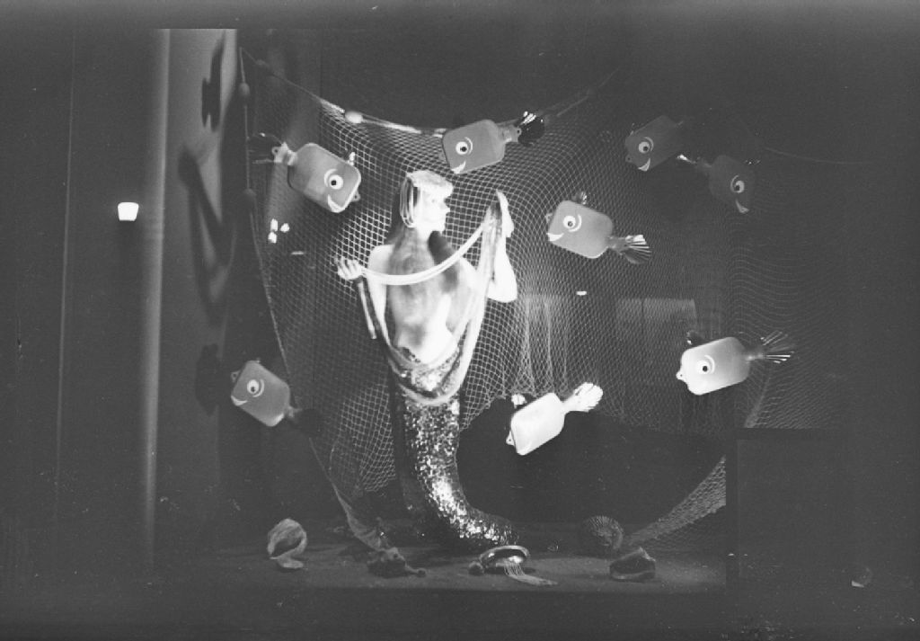 Nous voyons l'étalage d'une vitrine du magasin Ogilvy situé au 1307, rue Sainte-Catherine Ouest à Montréal. Il expose une sirène et des poissons pris dans un filet de pêcheur