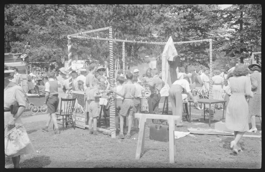 Nous voyons de nombreux visiteurs qui fréquentent la foire de la victoire de Westmount. Nous remarquons plusieurs stands ainsi qu'une affiche faisant la promotion d'achat d'obligations de la victoire