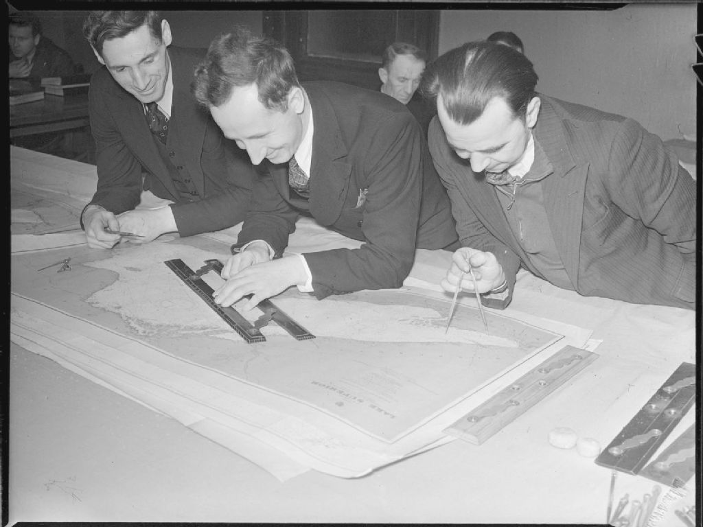 Trois étudiants de l'école navale de Québec font des relevés sur une carte du lac Supérieur avec des règles parallèles et des compas. Cette institution est située au 352, place Royale à Québec