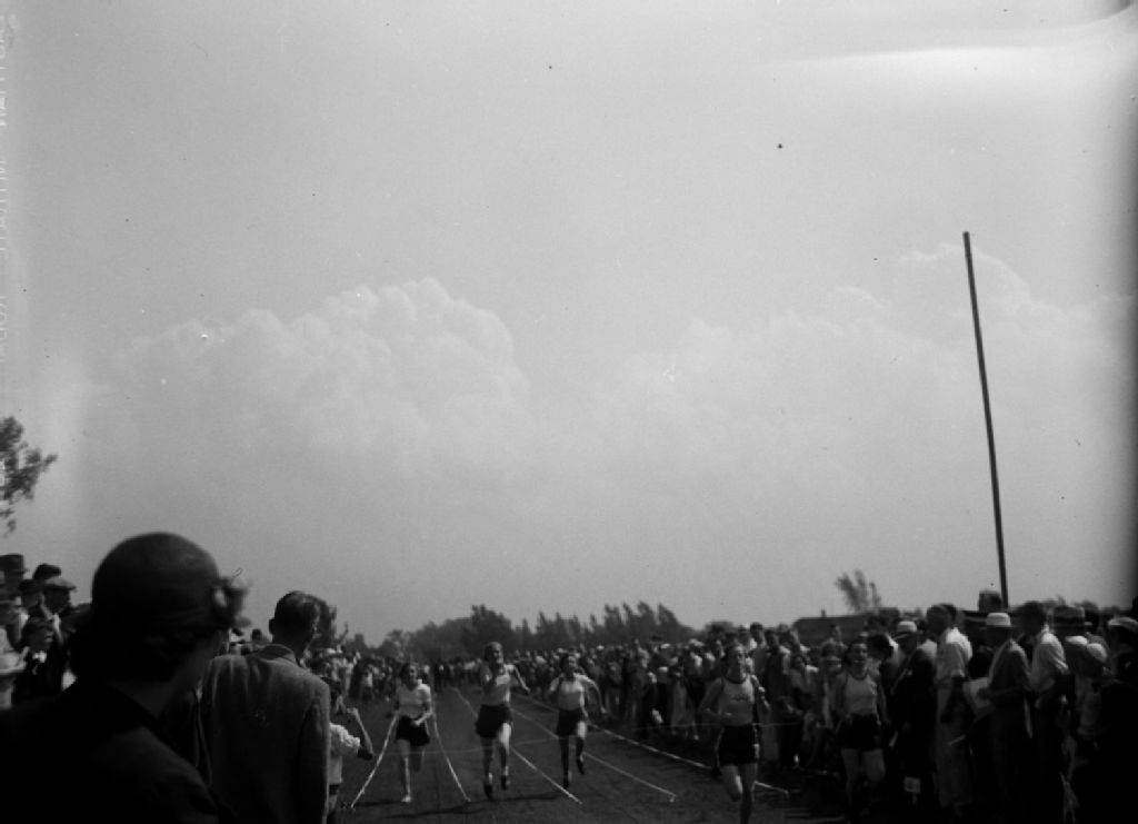 Femmes participant à une course au cours d'une compétition d'athlétisme. Nous apercevons un public nombreux
