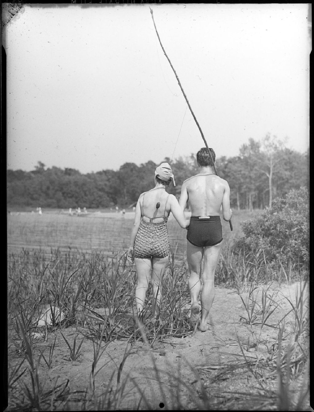 Margaret Oscarson et Fernand Gauthier marchent au bord de l'eau. L'hameçon de la canne à pêche est toujours accroché au maillot de la jeune femme