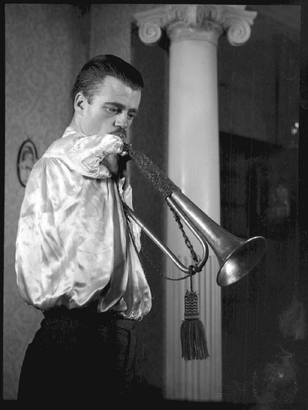 Lucien Côté, sans bras, souffle dans un clairon qu'il tient avec sa main située à l'épaule