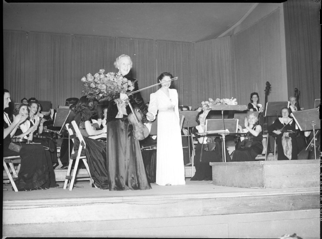 Une violoniste, tenant une gerbe de fleurs et son violon, salue le public. À ses côtés nous remarquons la chef d'orchestre Ethel Stark et des musiciennes du «Montreal Women's Symphony Orchestra»