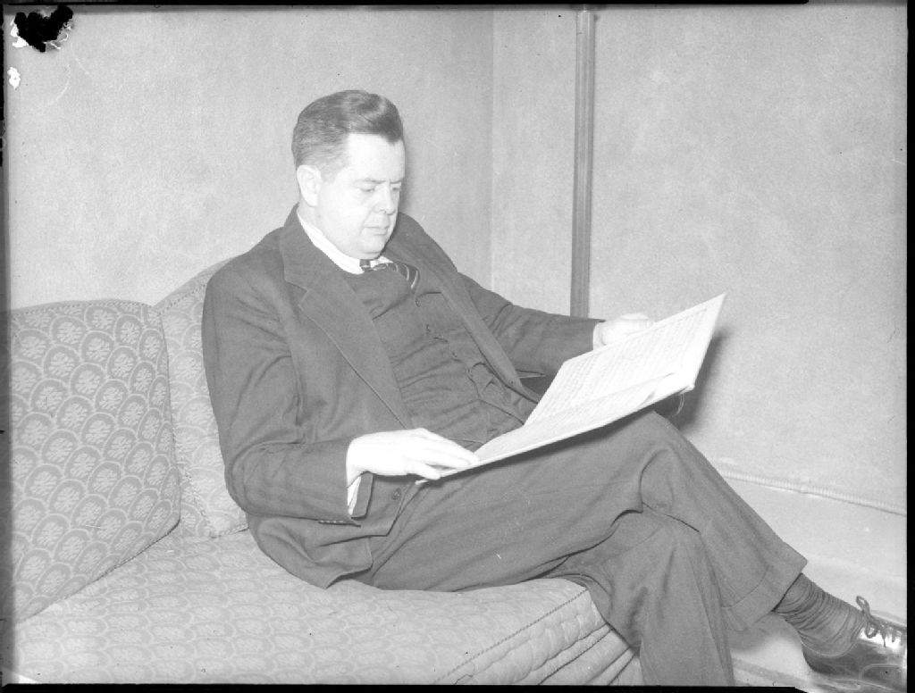 Sir Ernest MacMillan, du Conservatoire de musique de Toronto, lit une partition musicale assis sur un canapé