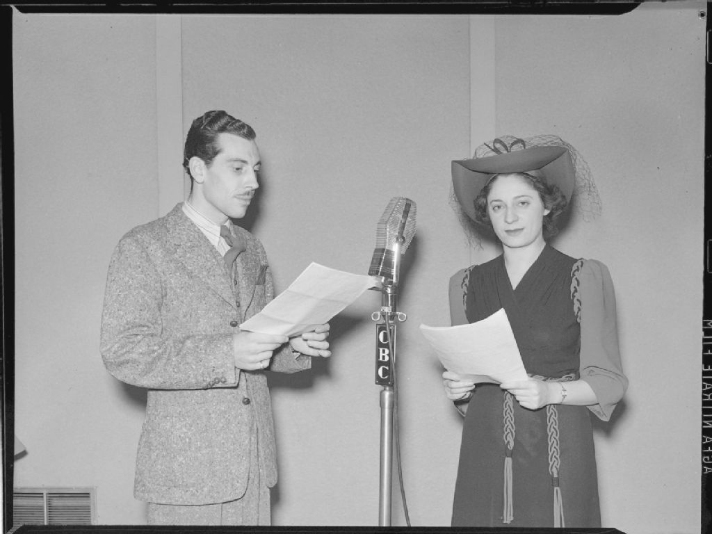 Nous voyons madame Ethel Stark, chef du «Montreal Women's Symphony Orchestra», et un animateur. Ils sont debout derrière un microphone dans un studio de la Canadian Broadcasting Corporation (C.B.C.)