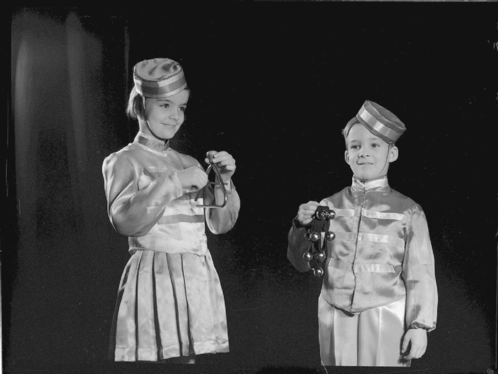 Nous voyons deux jeunes musiciens en uniforme qui font partie d'une fanfare. Ruth Pemberton Smith joue du triangle et David Pemberton Smith joue du tambour de basque