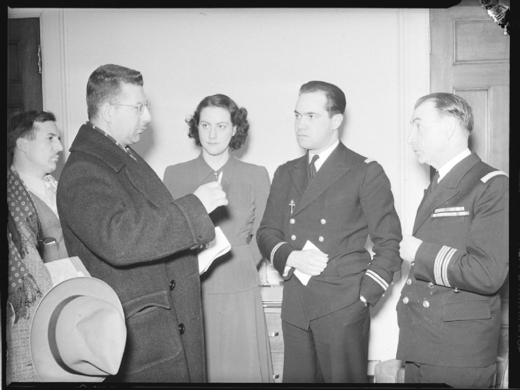 Nous voyons le commandant Thierry d'Argenlieu, représentant de Charles de Gaulle, Alain Savary et Élisabeth de Miribel qui s'entretiennent avec des journalistes à l'hôtel Windsor de Montréal