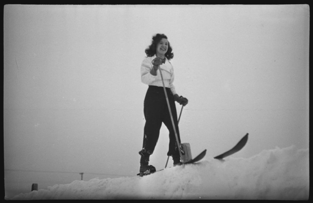 Skiing. Violet lambert, 18 janvier 1941, Archives nationales à Montréal, Fonds Conrad Poirier, (06M,P48,S1,P7208), Poirier, Conrad.