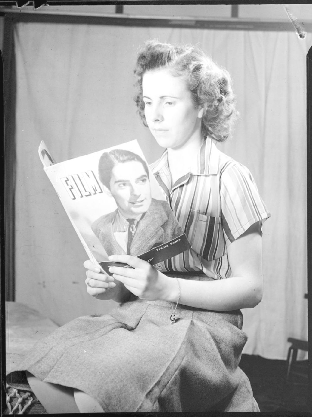 Eileen Greenwood lit la revue «Film» assise sur une chaise
