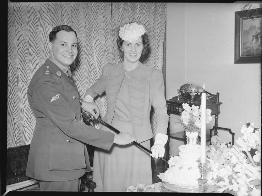 Les nouveaux mariés David Spielman, en uniforme militaire, et Catherine Skinner coupent leur gâteau de noce avec un sabre