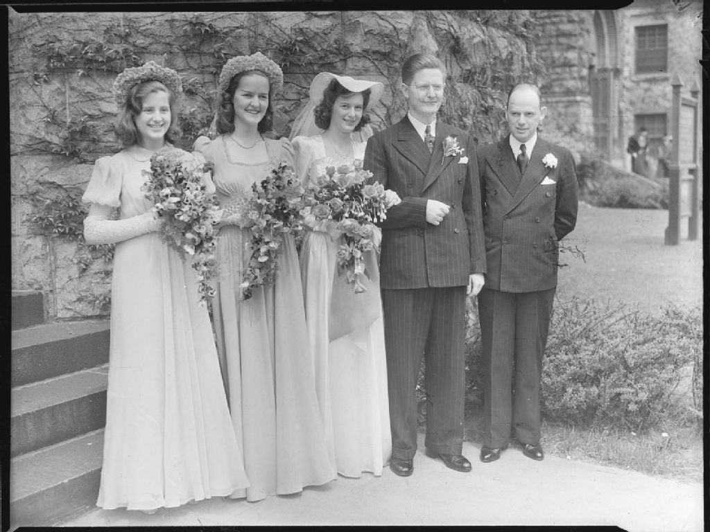 Nous voyons les nouveaux mariés Mavis Smardon et Eric Morris avec les demoiselles d'honneur Mary Morris et Barbara Smardon et le garçon d'honneur L.D. Murray