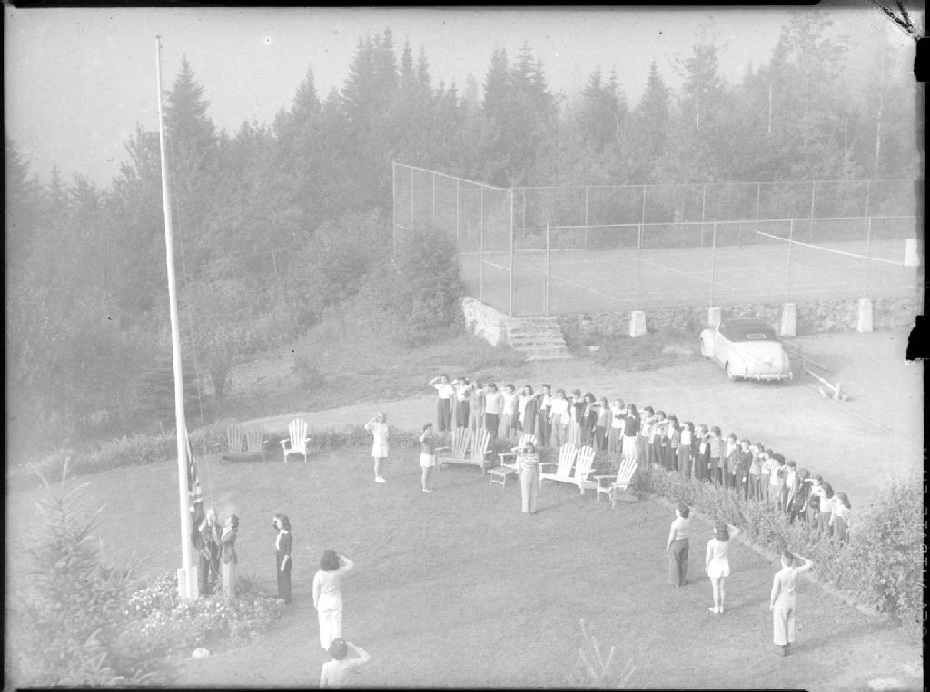 Des adolescentes font le salut au drapeau pendant que deux de leurs compagnes hissent le «Union Jack». Cette cérémonie se déroule à la colonie de vacances «Wooden Acres»