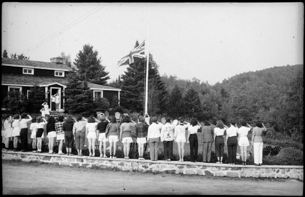 Des adolescentes font le salut au drapeau «Union Jack» pendant que deux de leurs compagnes le descendent du mât. Cette cérémonie se déroule à la colonie de vacances «Wooden Acres»
