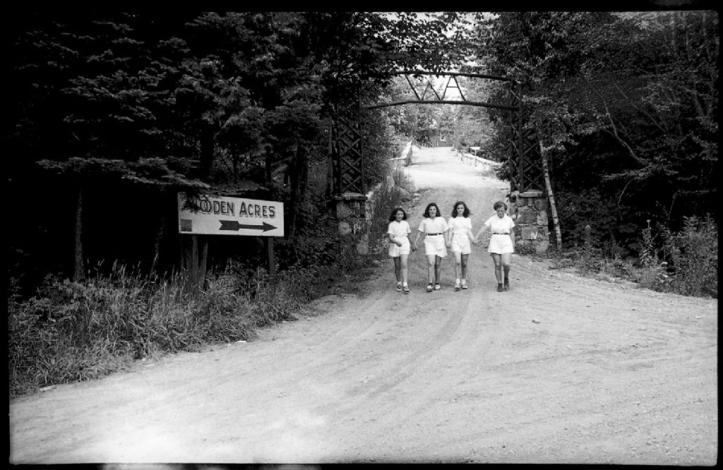 Quatre adolescentes marchent en se tenant par la main sur le sentier qui mène à la colonie de vacances «Wooden Acres»