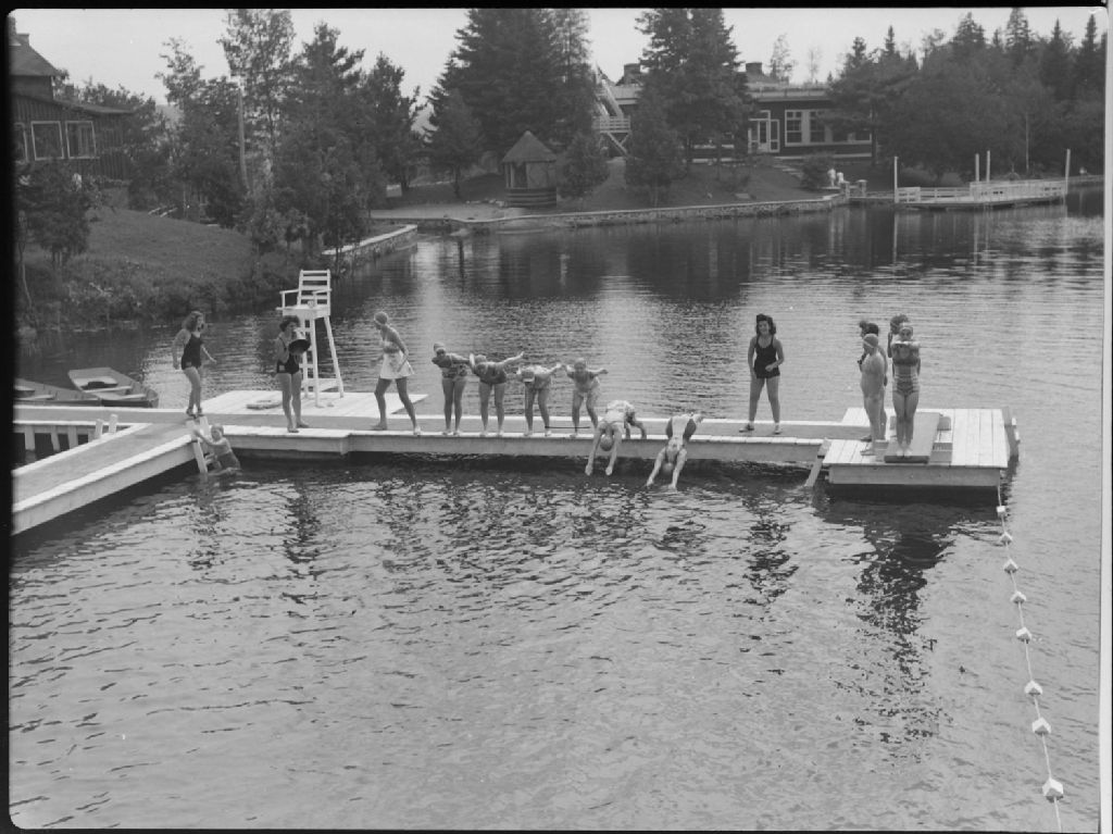 Des baigneuses plongent d'un ponton. Une monitrice de la colonie de vacances «Wooden Acres» leur parle dans un porte-voix