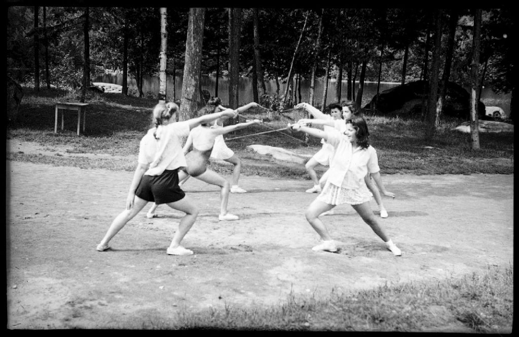 Six campeuses font de l'escrime sur le site de la colonie de vacances «Wooden Acres»