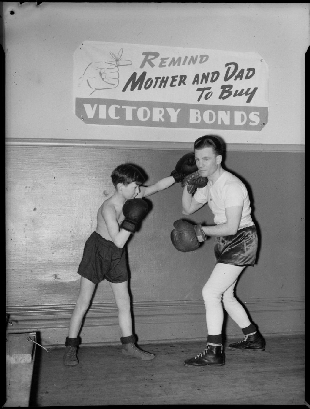 Un jeune garçon s'entraîne à la boxe contre un adulte dans les locaux du Club Kinsmen de Rosemont. Une affiche au mur fait la promotion de l'achat d'obligations de la victoire