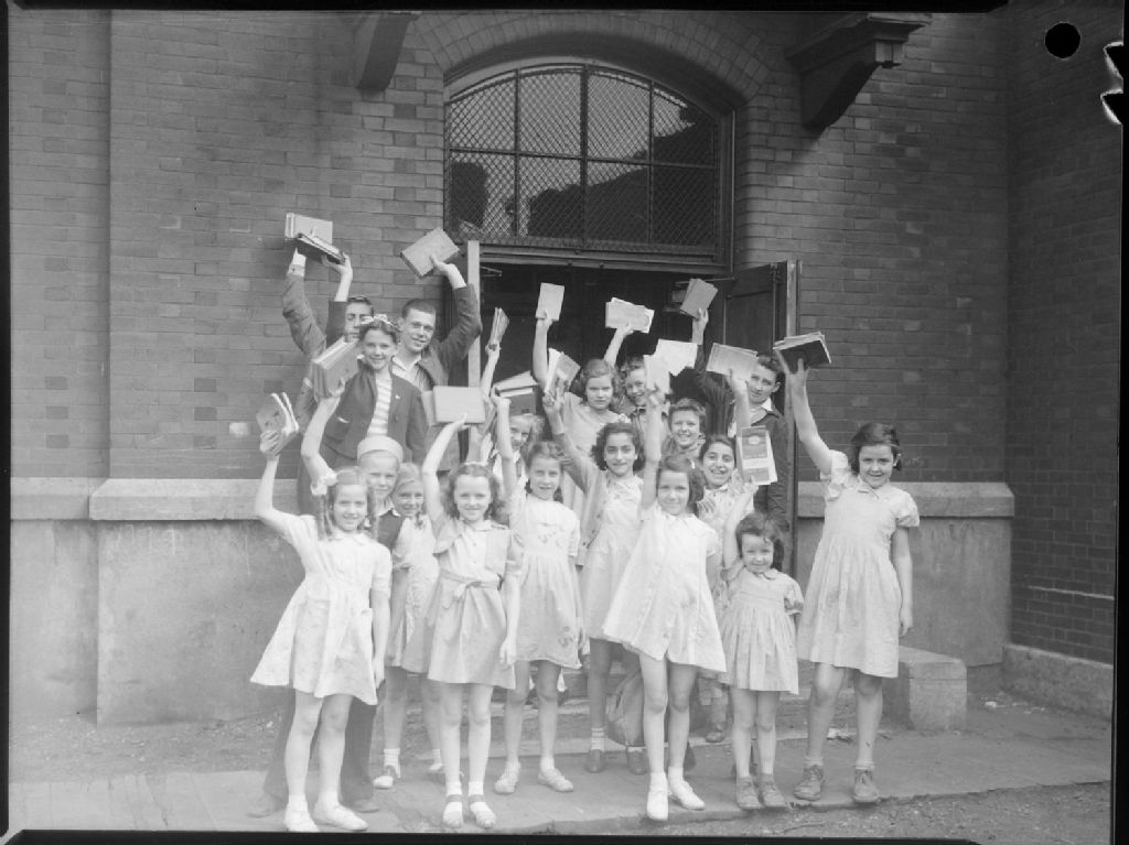 Des écolières et des professeurs brandissent leurs manuels scolaires avant de partir en vacances. Ils sont devant la porte d'entrée de l'école Edward VII située au 6080, avenue de l'Esplanade à Montréal